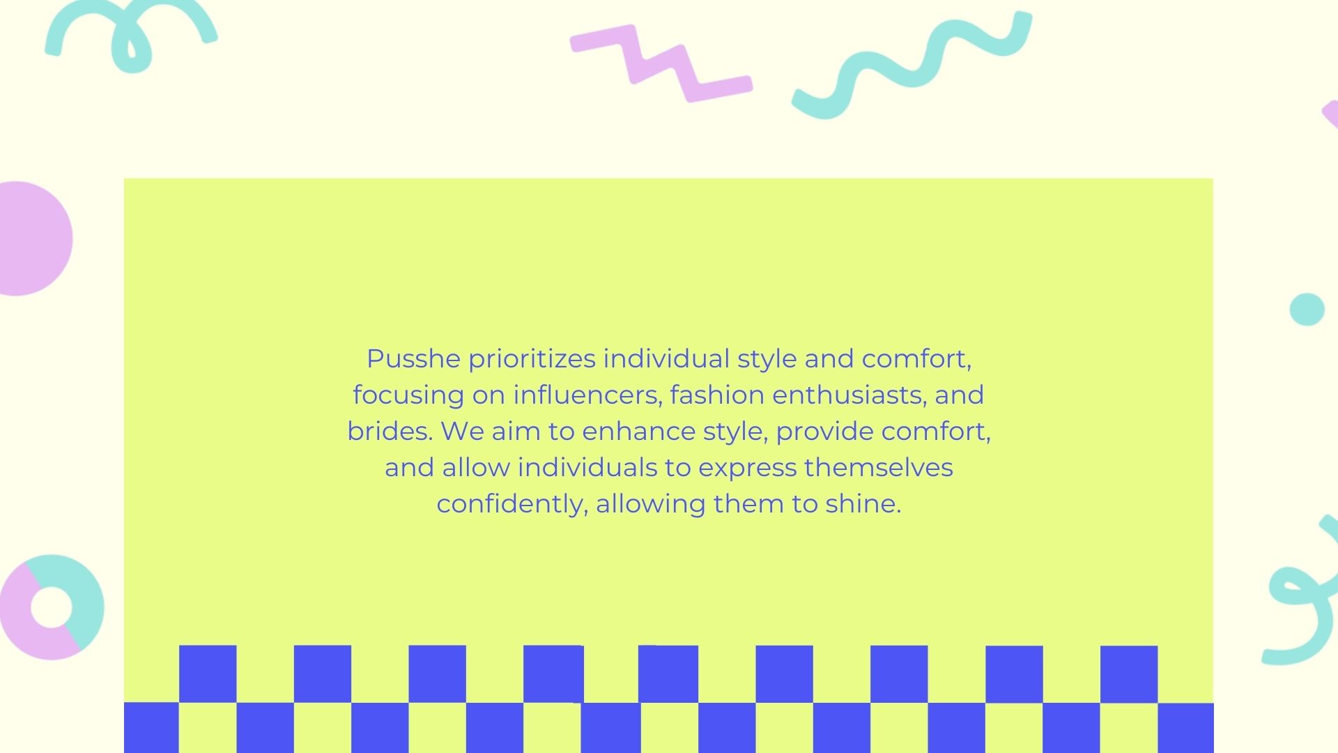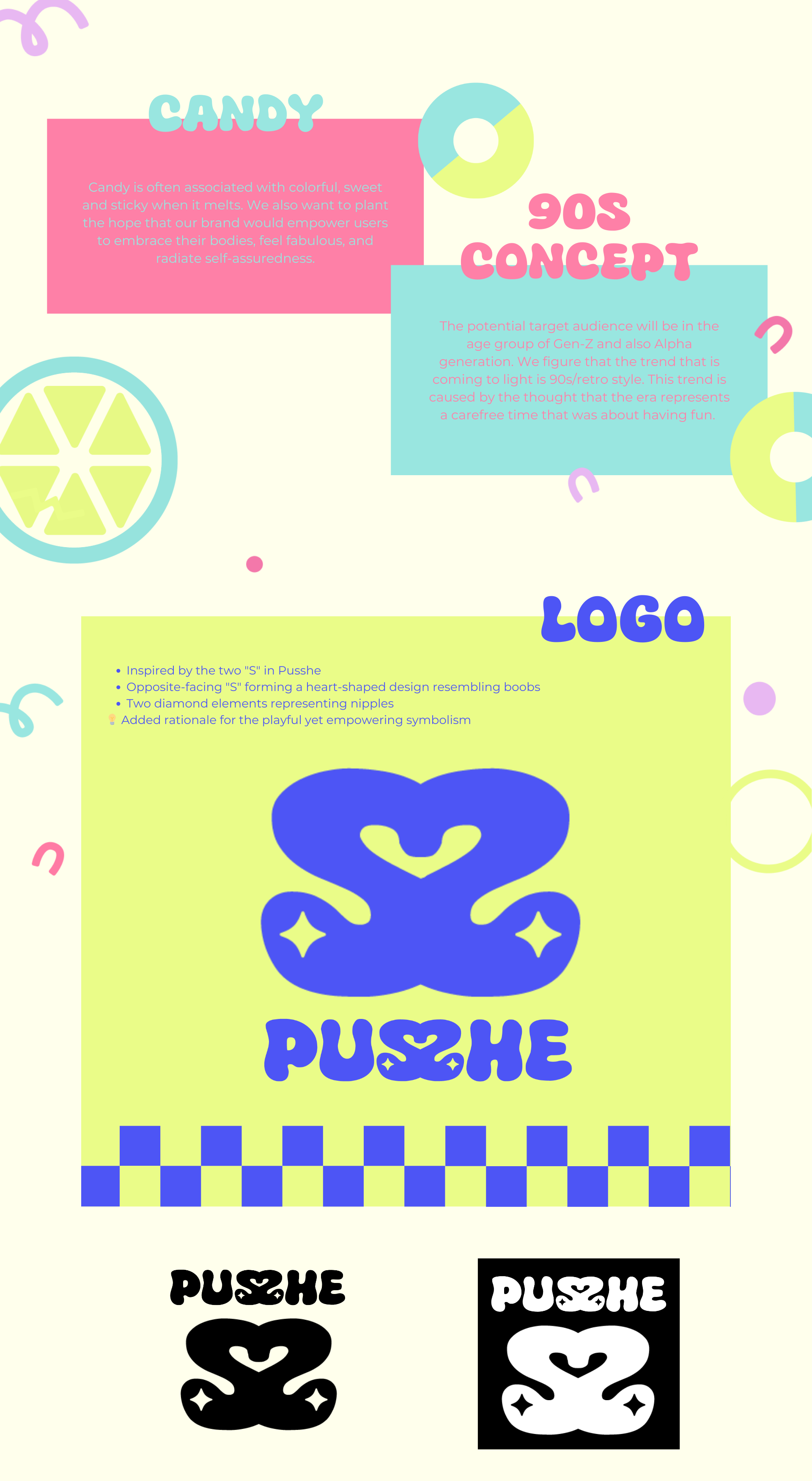 To solve this, Pusshe embraces a Memphis-inspired design with vibrant colors and bold typography, creating a brand identity that is both fun and empowering. The distinct logomark, featuring heart-like "S" shapes and diamond details, adds a touch of playfulness and confidence. The website design maintains a clean yet lively aesthetic with easy navigation and consistent styling, while engaging content, including playful illustrations, enhances the brand’s storytelling and market presence.